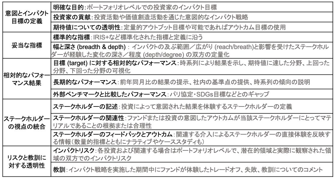 本調査レポートでは、基本的な要素として理解しやすいフォーマットや指標の基礎となる計算や情報の引用などの明確性(Clarity)と、ポートフォリオレベルと各投資両方の分析と、ポジティブなインパクトだけでなくリスクの正負の網羅性(Completeness)が包括的要素として重要としています。